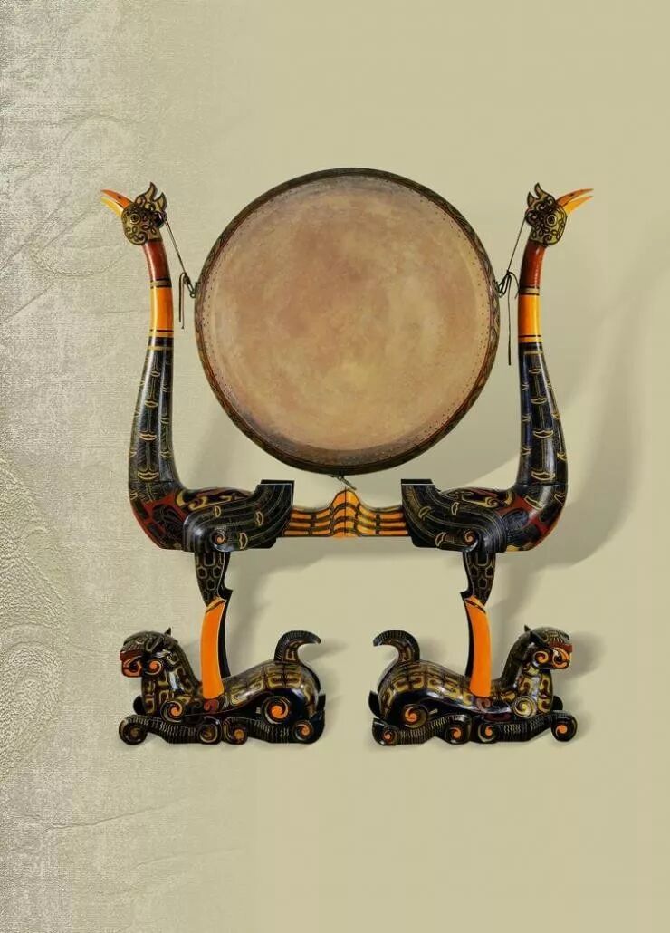 一对凤鸟背对背站立在两只匍匐着的老虎身上,中间架起了一面彩绘的大鼓,巧妙之余,含蓄地表现出楚文化的强势。