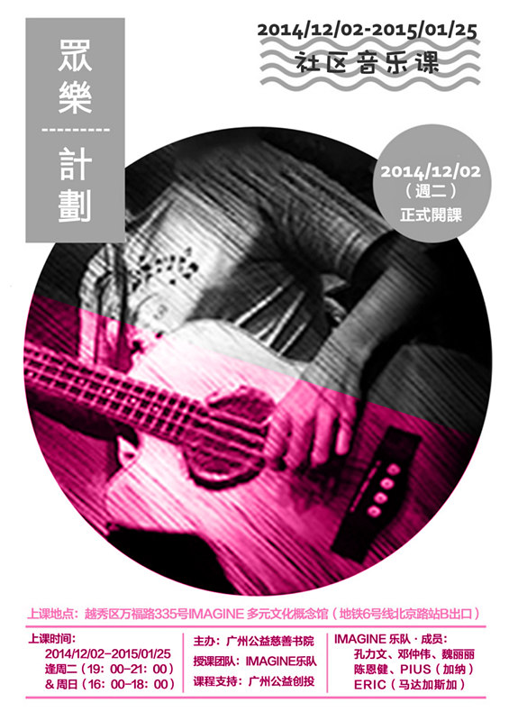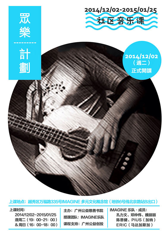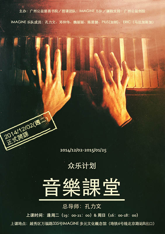 广州公益慈善书院希望为喜欢音乐的朋友们提供一个交流学习的平台,为此,我们将启动“众乐计划”,开设社区音乐课堂,向大众提供免费音乐教育,让音乐以平民的姿态走进社区,成为普罗大众的精神粮食。此外,我们还希望参与课程的学员在音乐中提升自我的同时,与我们一起推广公益事业,推动更多的音乐爱好者分享音乐知识,让更多喜爱音乐的人获得免费的学习机会。
