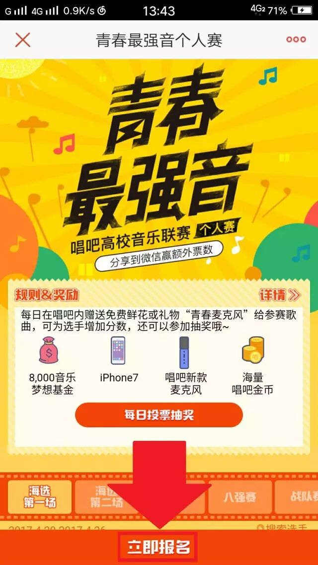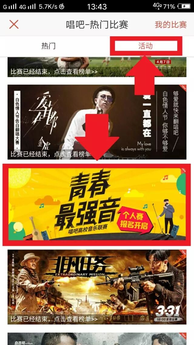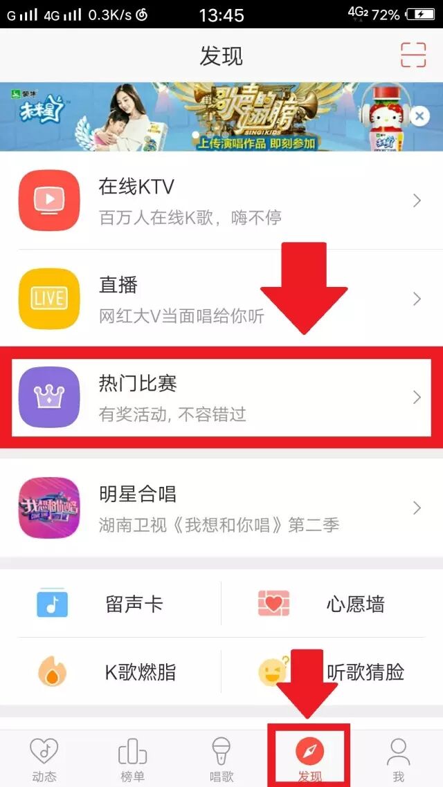 1.下载唱吧APP,登陆后点击下方菜单栏“发现”→“热门比赛”。
