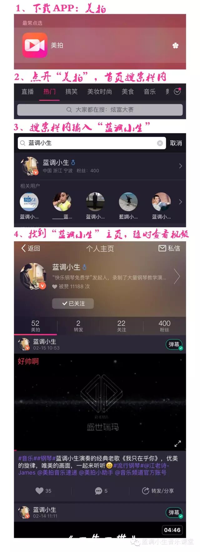 为了更方便大家琴技交流,蓝调小生开通“美拍”个人主页,随时在手机客户端更新教学及弹奏视频!当然啦,如果各位亲们想要得到蓝调小生的亲自点评,也可以将自己弹奏的视频上传至美拍,上传视频的时候,请记得选择“话题:#流行钢琴#”