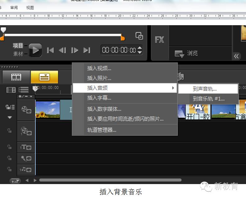步骤4:在软件下方的编辑区右击鼠标,在弹出的快捷菜单中选择“插入音频”→“到声音轨”,选择一首自己喜欢的MP3音乐文件,这样我们的相册就有背景音乐了。