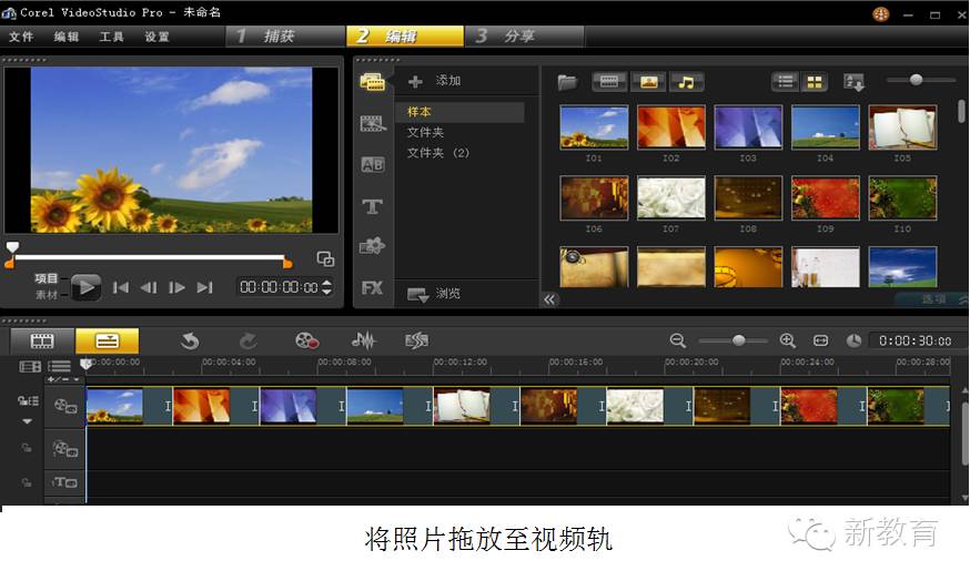步骤2:使用鼠标将导入的照片拖到下方编辑区的视频轨道上。在视频轨上可以直接用鼠标拖动照片来调整照片的播放顺序。