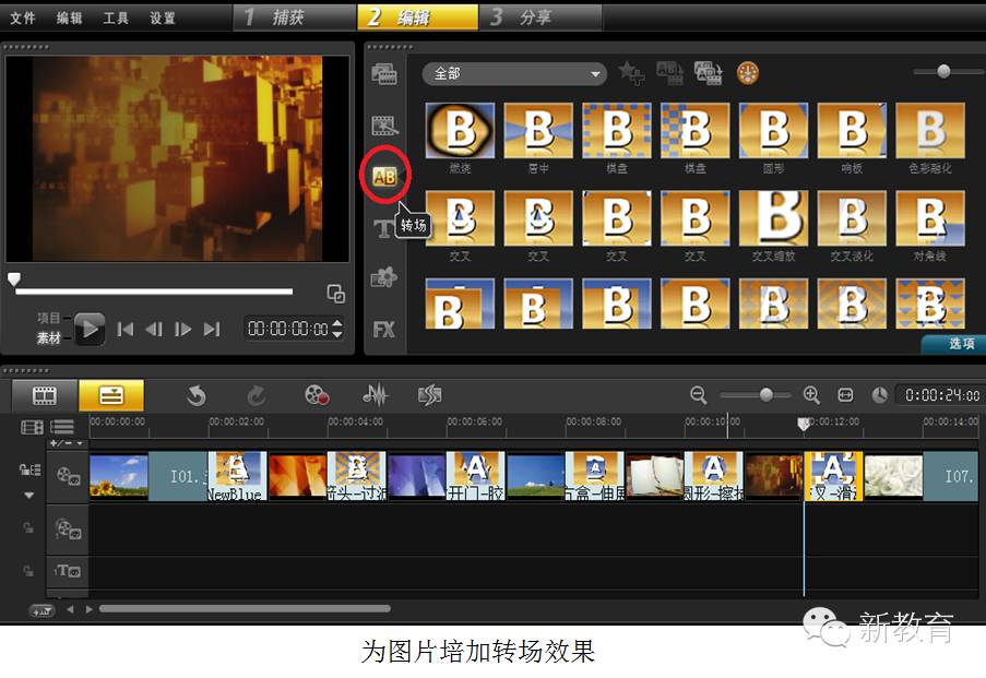 步骤3:在软件界面中间,选中“转场”接钮并点击,跟前面拖动照片的操作一样,直接把特效拖放到两个照片之间。