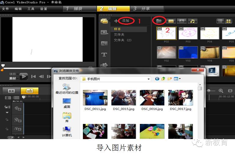 步骤1:打开会声会影X5,点击“添加”按钮,再点击旁边的小文件夹,将需要的素材(图片和音乐)全部选中后导入进来。