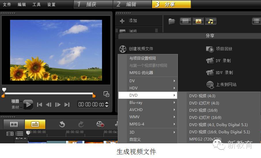步骤5:选择“分享”→“创建视频文件”项,再选择需要输出的格式,软件就会自动输出视频了。
