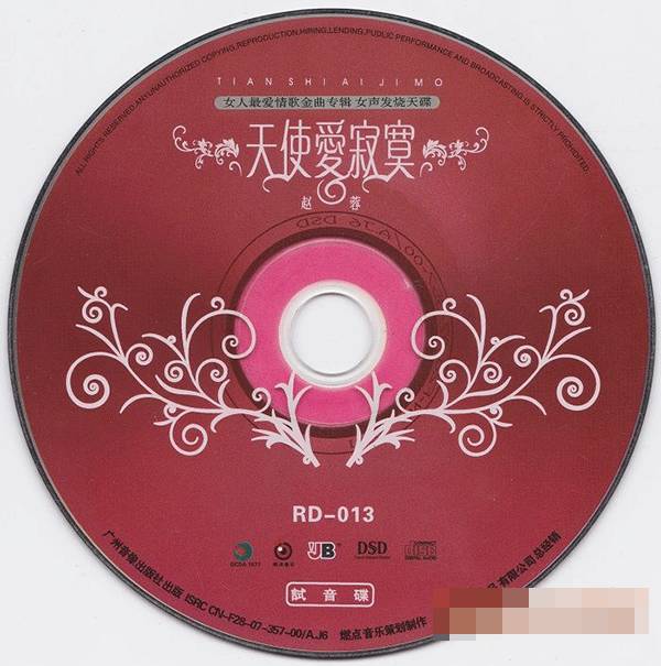 3、清润女声低吟浅唱经典发烧大碟 赵蓉《天使爱寂寞》 专辑名称: 天使爱寂寞 DSD(试音碟) 专辑艺人: 赵蓉 出版:广州音像出版社 策划制作:燃点音乐 发行:天艺音像制品有限公司 ISRC: CN-F28-07-357-00/A.J6 发行时间: 2008年01月08日 专辑介绍 清润女声低吟浅唱经典发烧大碟,让你尽情用心聆听夜的百转千回。一抹红唇在黑夜的奔腾中绽放,轻轻柔柔,一把纯如天籁的声线,在迥然不同的的曲风中莺绕,仿如在温柔的黑夜与狂野的纯红之间穿梭,一份柔肠百转的情感在回忆与现实间欲诉还休。夜,因为有了黑色的掩护,放纵也再无需理由,正如心灵深处的那块净土,思绪总能放任自由,随意驰骋。静夜中,音乐总能点燃心中的回忆,让它肆意进发出快意的火花。 德国顶级真空管录音及母带处理,记录最纯粹的音乐,带来真实温暖的音色和最自然传神的聆听效果。德国真空管录音黑胶发烧CD系列,心灵最深处的震撼绝版发烧天碟倾囊奉献;倾听夜的声音,感知夜的真实,让赤裸的思绪随着清润甜美的声线迭荡回旋。 曲目 专辑曲目 01. 相逢是首歌 02. 想起 03. 蓝莲花 04. 千年泪 05. 赞歌 06. 踏浪 07. 晚秋 08. 泪桥 09. 你的样子 10. 彩云追月 11. 断点 12. 红颜 試聽: