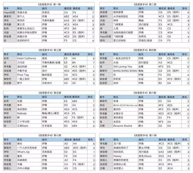 ▲1-8期竞演歌曲数据