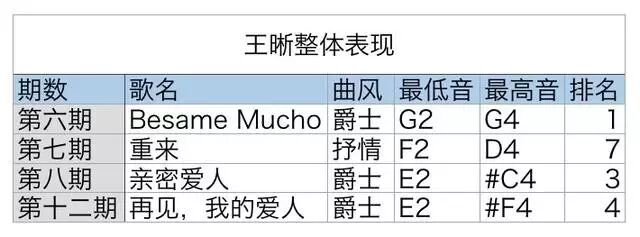 以低音见长的王晰在第六期以一首爵士曲风的《Besame Mucho》,成功踢走了爱飙高音的信。他能踢馆成功,主要原因还是迷人的低音。这个舞台上缺少以低音见长的歌手,王晰的出现带给了大家足够的新鲜感。他第一次在这个舞台上出现,就展现了G2到G4整整两个八度的音域,这也是他出色的能力之一。