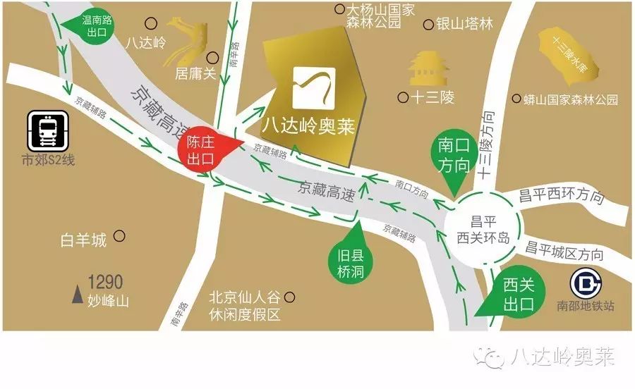 其他交通路线:G7京新高速出京方向,十三陵出口,右侧八达岭方向并入G6京藏高速行驶4公里,陈庄收费站驶出后即刻右转到达。