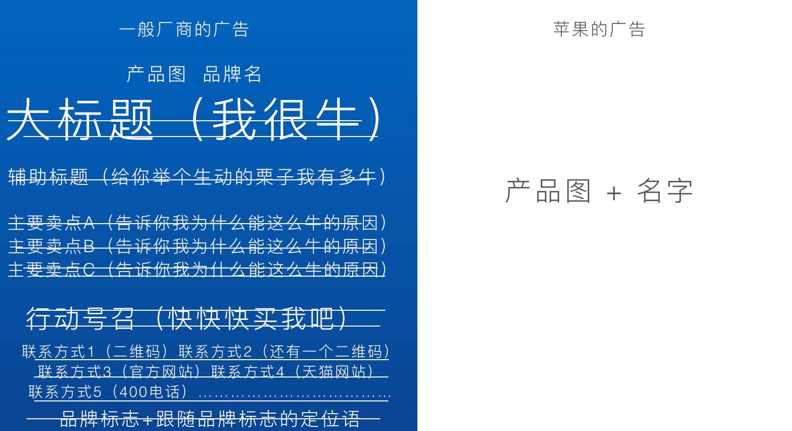 iPhone X的主要卖点A, B, C, D, E……,在全球数亿消费者关注的苹果发布会上,已经彻彻底底,清清楚楚地全部讲完了,那是真正2个多小时的超级广告;就算你没看直播,第二天也会有类似“带你3分钟看完苹果发布会”这样的视频和文章刷爆我们的朋友圈,还会有很多品牌的social团队连夜加班做出的蹭热点海报,都会在第二天朝你一并袭来;就算你关闭了朋友圈,还会有关于iPhone X的各种头条新闻充斥着你经常访问的各类视频网站、科技网站、电视等各路通道;就算你不看视频,不看新闻,你还会在上班时、开会时、闲暇时被同事安利,被朋友安利……