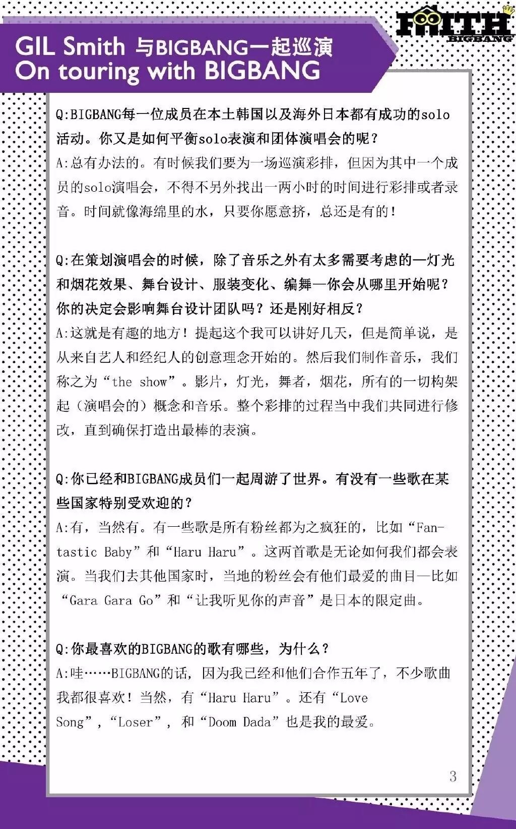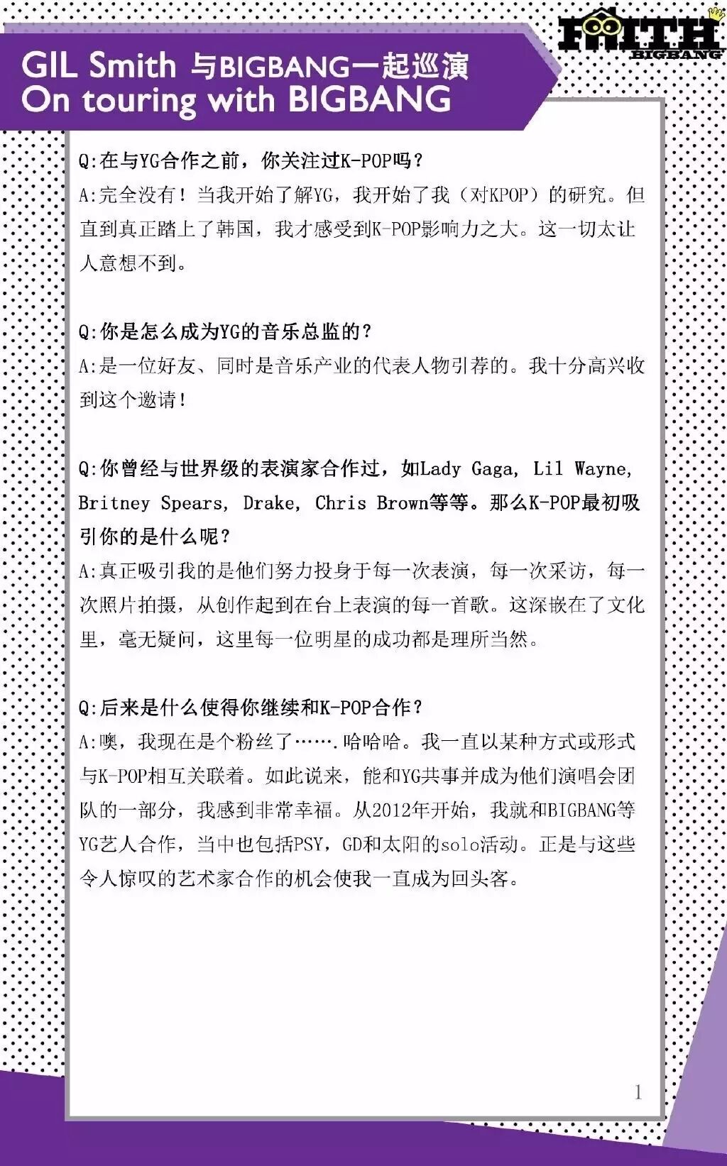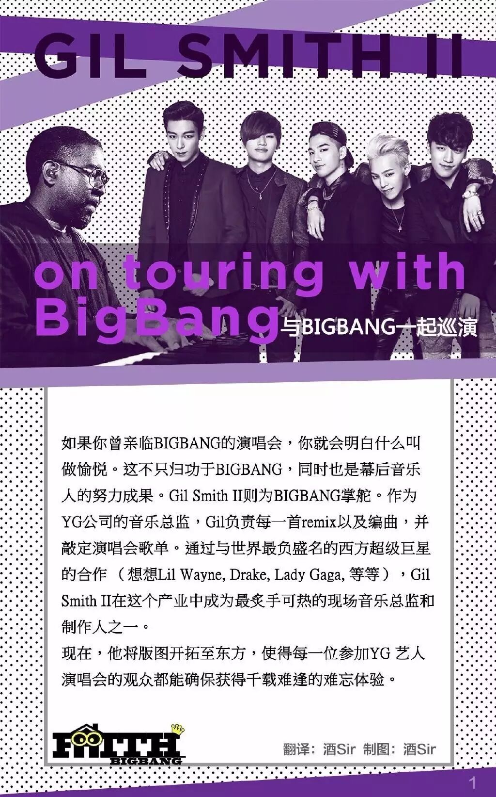 近期,YG公司的音乐总监Gil Smith II(演唱会音乐总监)在采访中这样评价与BIGBANG的合作:“制作BIGBANG的巡演之所以这么有意思,在于每一次巡演都是崭新的。他们的参与度相当高。这点特别棒,因为有五个音乐天才来帮忙创造出最棒的两个半小时。任何亲临演唱会现场的观众都能看到并听到令人享受的多样性,离开时也会带着每个成员内心的一瞥风景。”