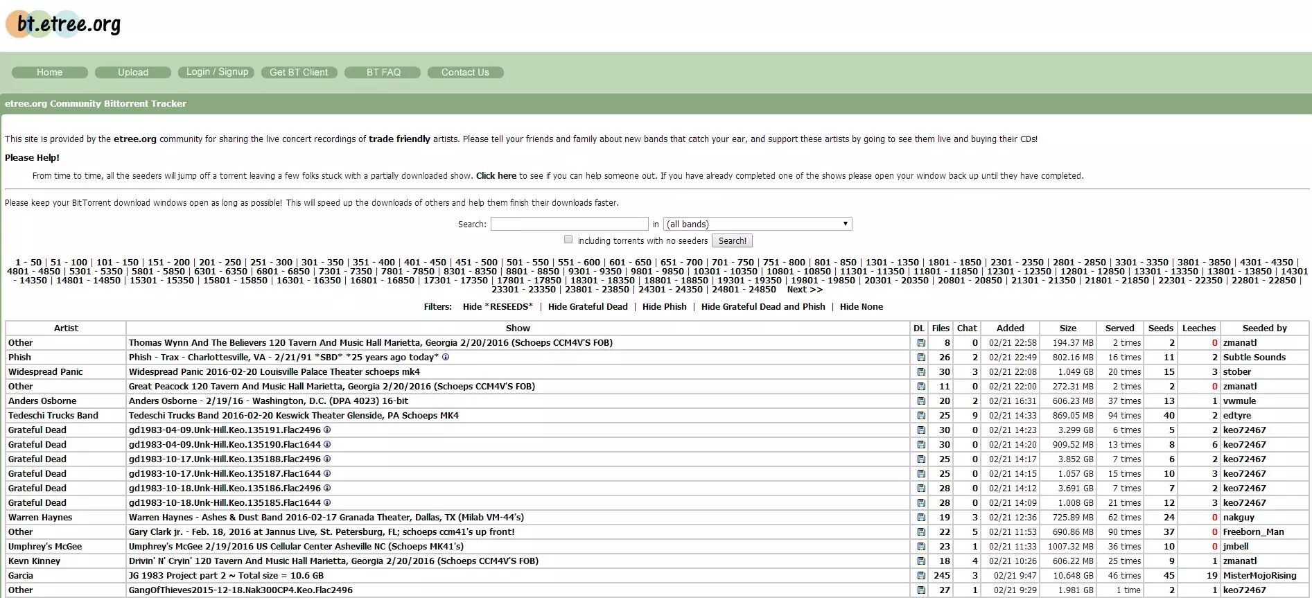 bt.etree.org靠为很多私下关系很好的乐队录制音乐为生。你几乎可以找到各种各样的FLAC音乐下载。像Ben Harper、Jerry Garcia、Blues Traveler、Trey Anastasio、Radiohead、Primus,甚至Tenacious D的音乐都可以找到。