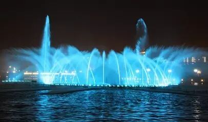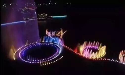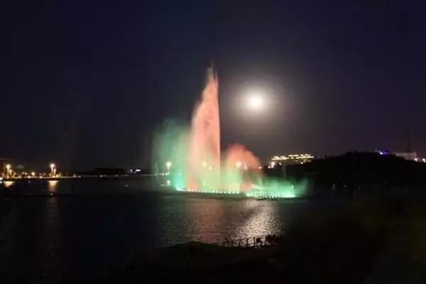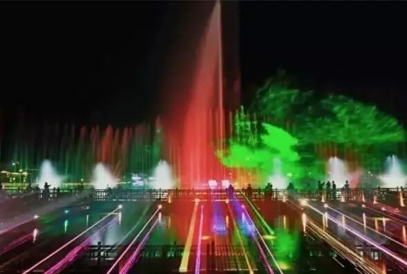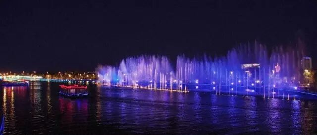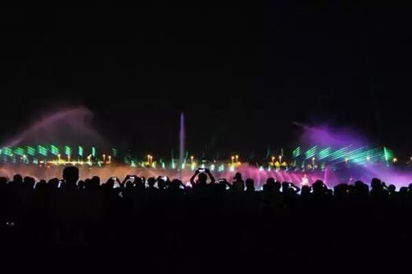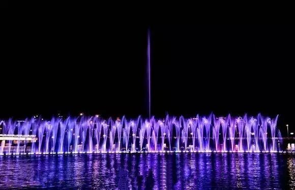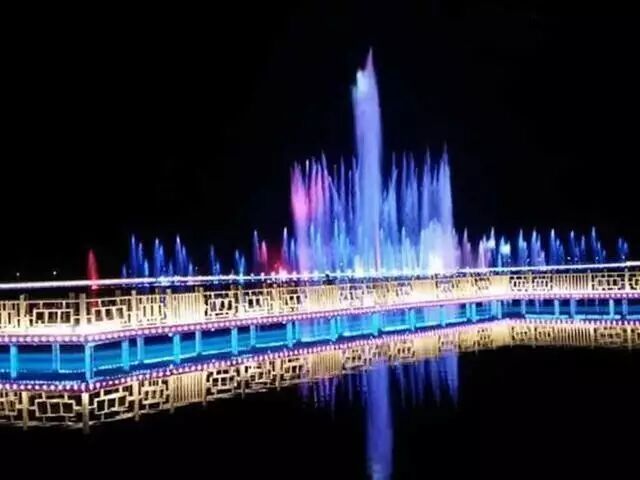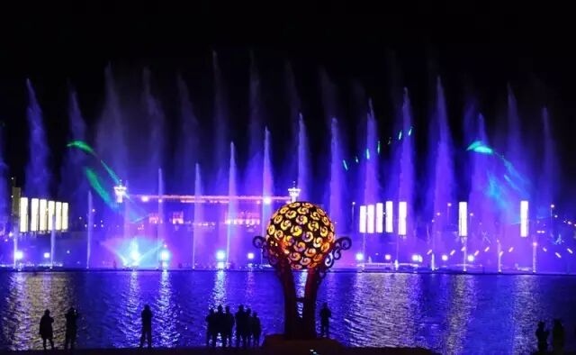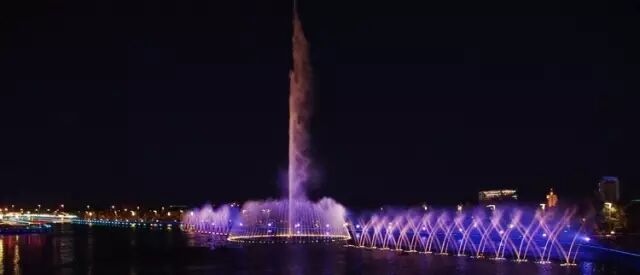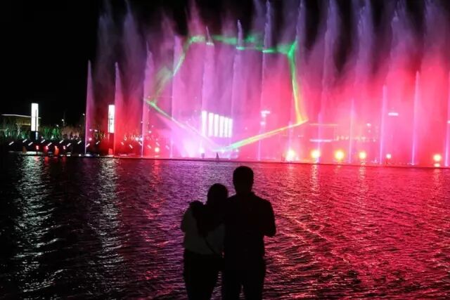不断变幻的彩灯与喷泉呈现出的万千形态交相辉映,使得波光粼粼的水面更加如梦如幻。