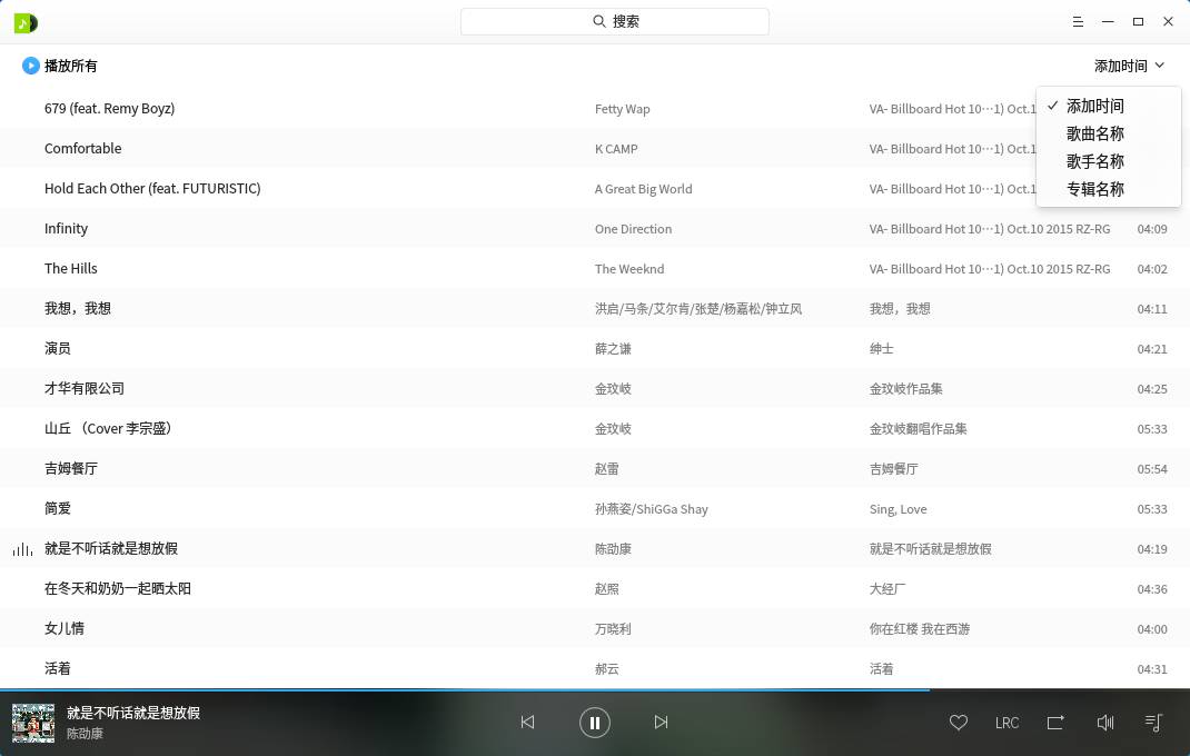 播放列表默认按照添加时间排序,列表中显示歌曲名称、歌手、专辑和歌曲时长,也可以选择自定义排序:添加时间、歌曲名称、歌手名称、专辑名称。