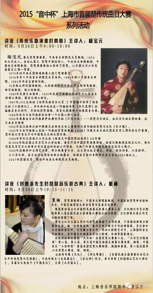 25日的决赛结束之后,大家可以放松一下,26日的上午我们为大家安排了两场精彩的琵琶艺术讲座: