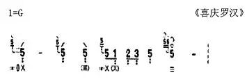 《喜庆罗汉》(谱例7)是刘德海先生采用佛曲《普庵咒》、昆曲曲牌《收江南》为素材创作的。全曲仅用弹挑与中指反正弹技法完成,凤眼的手形使作品音色极为清亮、饱满,凸显“拨子”坚挺的颗粒之美。
