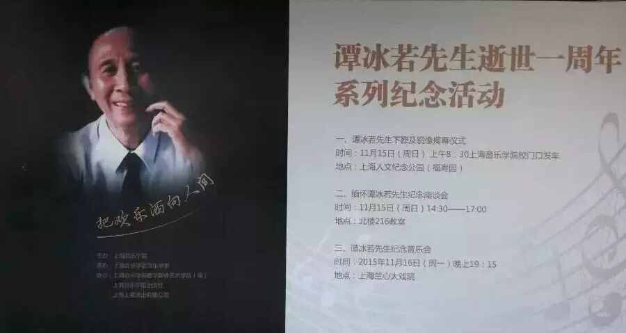 纪念音乐会那天(2015.11.16),谭先生家门口的路上又铺满了他最爱的梧桐落叶,整整一年了,没有见到他,可每当他的学生们翻开乐谱、打开音乐、放声高歌的时候,就好像他从未离开,还在不厌其烦地讲一部作品,还再弹琴上课,叫学生们再唱一遍,还在给他们泡咖啡、煮红豆汤。我想曾谭先生身边走过的人都会想他。谭先生为音乐默默耕耘了一辈子,自己也曾说走的“不无遗憾”。而一年多以前,他从病房的阳台眺望兰心戏院,学生们看见他的眼神里满是牵挂。从“兰心大戏院”这个摇篮开始,在上海这个特别的地方特别的历史时期,凝结了谭先生对音乐大爱的世代相传的感怀、眷恋和期盼。音乐会那天,兰心戏院的舞台蓬荜生辉,大家齐聚,是为继续永不老去的音乐、青春和大爱。