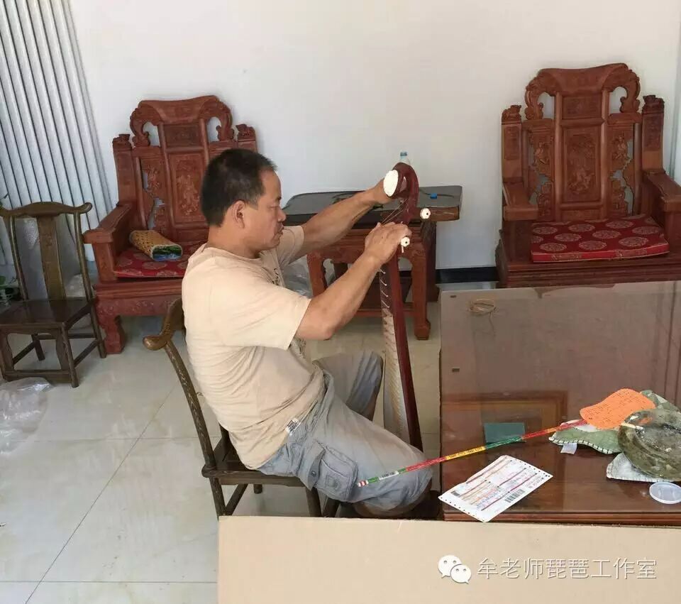 (下图:牟老师亲自试弹仇老师制作的琵琶)