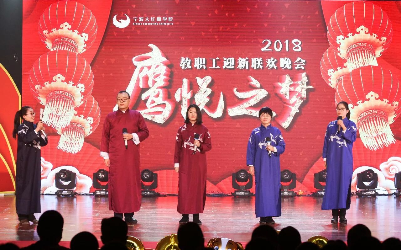 12月29日晚,学生活动中心五楼暖意融融,处处洋溢着迎新的欢乐气氛,鹰悦之梦——我校2018年迎新春联欢晚会正在这里举行。全体校领导同千余名教职员工欢聚一堂,共同欣赏迎新春文艺演出,欢送硕果累累的2017年,喜迎充满希望的2018年。本场联欢晚会好戏连台,歌曲舞蹈、相声小品、情景朗诵、民乐演奏、武术表演、家庭亲子秀等多种文艺节目精彩纷呈,或清新活泼或优雅精致或如诗如画,充分展现了我校师生“不忘教育初心、牢记时代使命”的崇高追求和意气风发的精神风采。