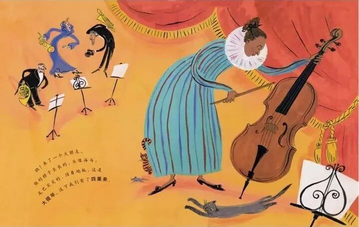 瞧!来了一个大朋友,他的脖子长长的,头像海马,尾巴尖尖的,顶着地板,这是大提琴。这下我们有了四重奏。