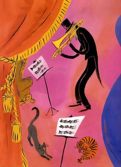 例如:圆号由矮矮胖胖的绅士演奏,大提琴的演奏者穿着条纹装,身上一条一条的花纹,与琴弦呼应着。拉小提琴的是一位穿礼服的酷哥,看看他浪漫的金发,似乎暗示着琴声的委婉多情。