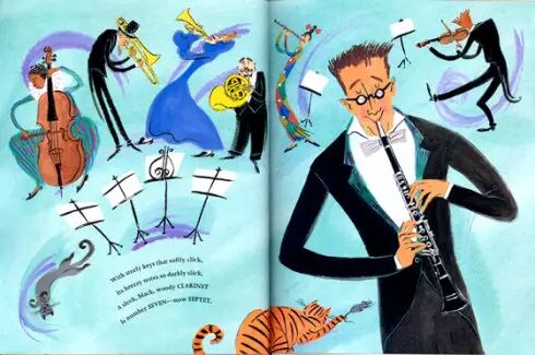 小提琴的声音是“又细又高,好像飘在空中的细丝带”。单簧管的声音是“好像你闭着嘴巴哼歌那样”。