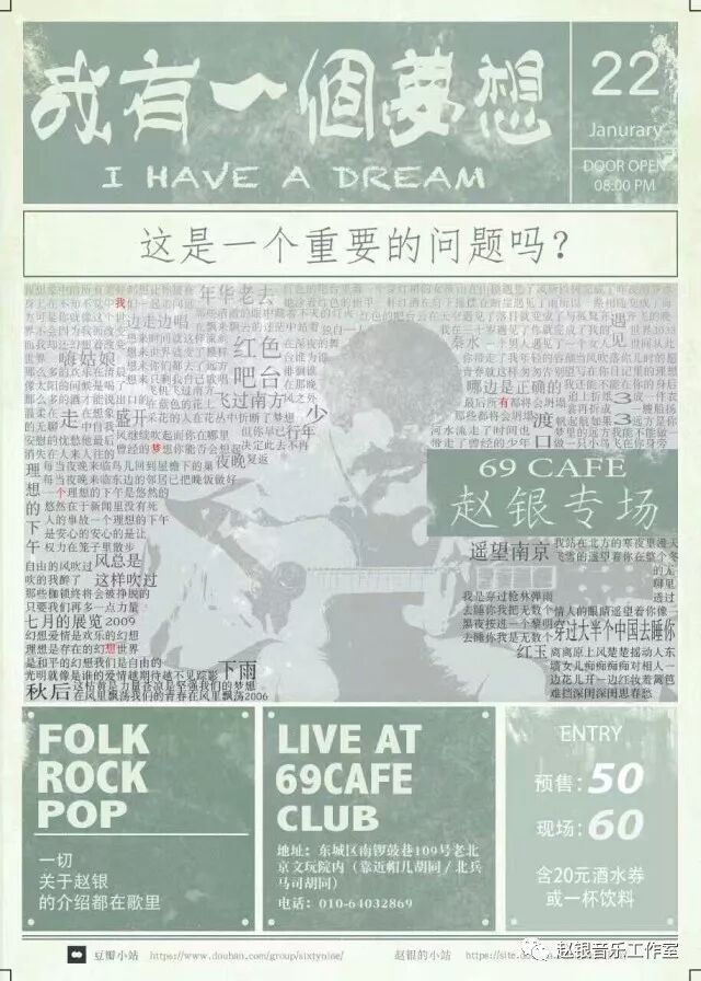 除了做赵银自己的独立演出外,工作室也将定期开展音乐沙龙活动,所有喜欢音乐的朋友都可以来参加。我们将根据不同季节时段的特点策划丰富的主题内容。