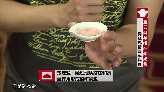 烤制羊肋排时要用到玫瑰盐,而玫瑰盐是经过地址挤压和高温作用形成的矿物盐,与我们平常的食用盐相比有独特的风味。