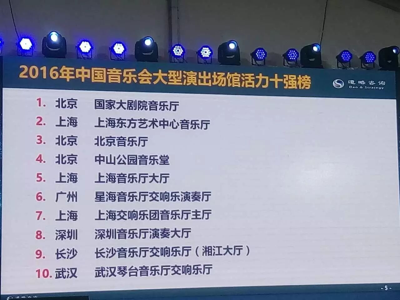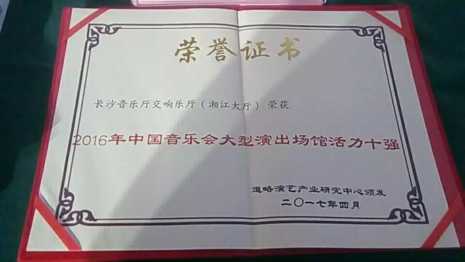 2017年4月,由北京市支持、道略演艺产业研究中心主办的2017“演艺北京”博览会在京举行。在13日举行的剧场创新运营大会上,长沙音乐厅位列“2016年中国音乐会大型演出场馆活力十强榜”的第九名,除北上广城市外第一名!据悉,此次评选共有20个演出场馆入围,排名依据是全年演出观众数(权重70%)和演出场次(权重30%)。