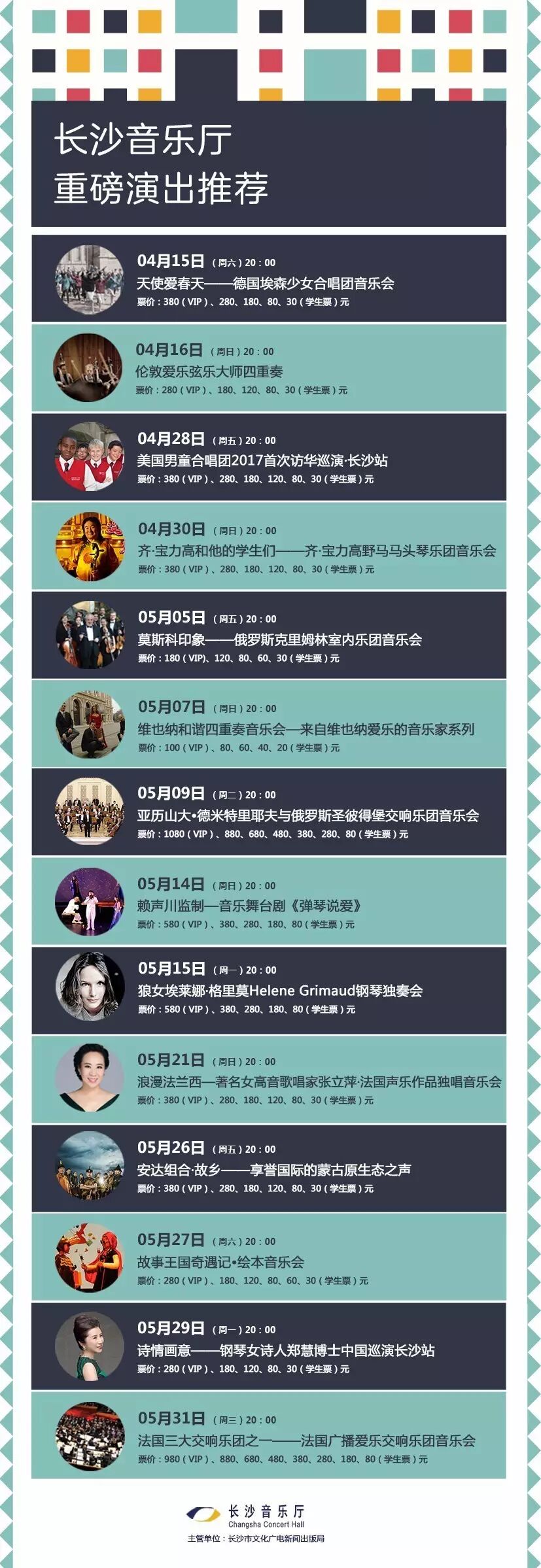 在时光淬炼里,日久弥新。2017年上半年,伯明翰市立交响乐团、圣彼得堡交响乐团和法国广播爱乐乐团三大名团齐聚长沙,5月15日长沙音乐厅史上最大牌顶级钢琴家“狼女”格里莫首度造访星城!长沙作为全球名家名团优先考虑的巡演城市之一也是对长沙音乐厅最大的认可!长沙音乐厅必将不忘初心,砥砺前行!2017我们一起撸起袖子加油干!