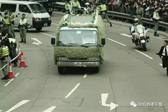 灵车外面覆盖着淡绿的鲜花,后面有一身穿白色警服的交通警骑着摩托车跟随,灵车的挡风玻璃有一张巨幅的张国荣照片,匆匆从等待的歌迷前驶过。灵车开出后,满街的歌迷都哭不成声,纷纷挥手向亲爱的哥哥作最后的告别。