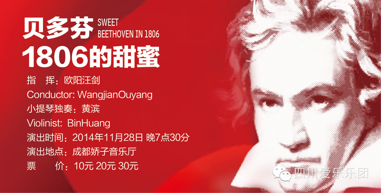 11月28日音乐季《贝多芬1806的甜蜜》音乐会!本场音乐会由欧阳汪剑先生执棒,携手国际著名小提琴家黄滨女士为您演奏贝多芬小提琴协奏曲。