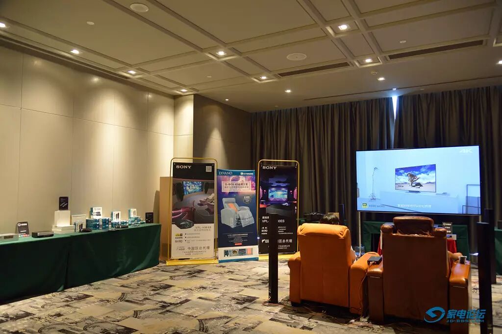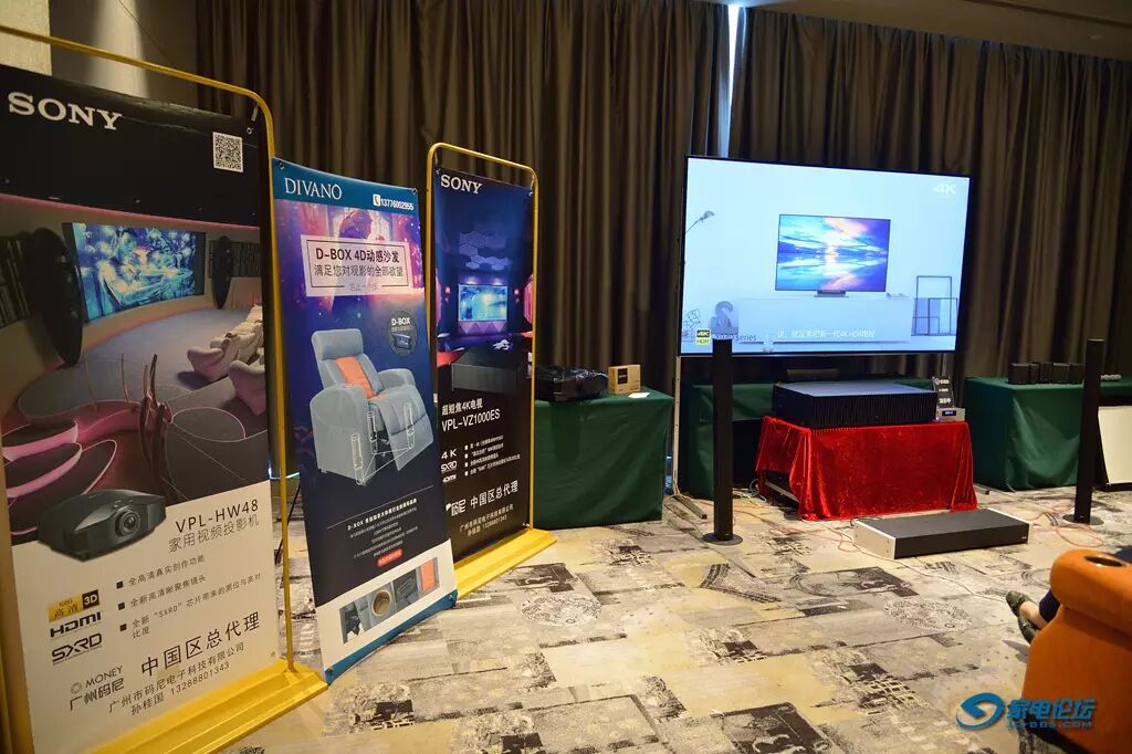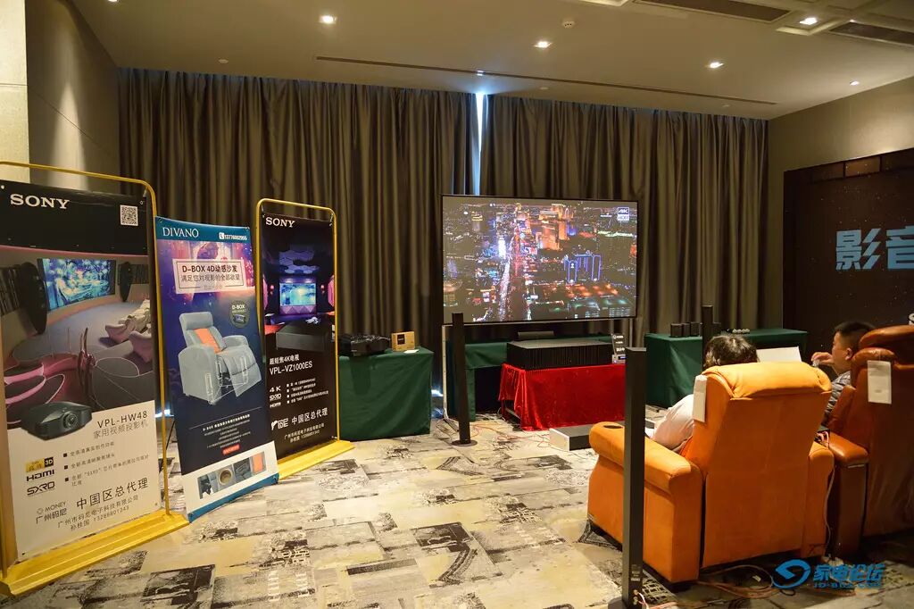外侧的展室有一套Sony超短焦投影机VPL-VZ1000,投射出100寸的画面,配合Teufel音箱一套小型影院系统,配合优视加播放器和谛凡喏 D-BOX座椅,展出了一套客厅影院组合。Sony投影机市场性价比高、销售最火爆的机型Sony HW-68投影机这次也是静态展示。