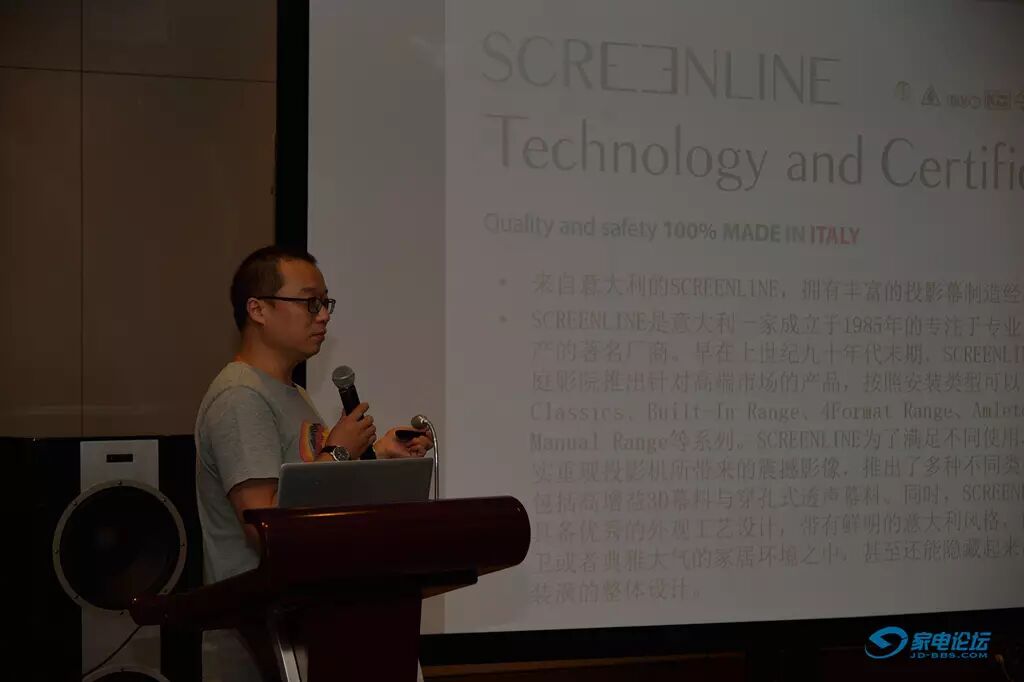 广州隽丰影音公司产品经理赵杨向大家展示了这块180寸透声幕布的特点,来自意大利的SCREENLINE是采用了0.4MM微孔的透声技术,不光是有较好的透声效果,而且对于投射光的反射也有极小的光损耗。Sony VW1100在这块幕布上的投出的画质效果非常鲜活,通透,饱满,而且在幕布后面的三只Teufel主音箱的声音也有非常好的穿透力!大家充分感受到这块幕布兼顾透声和超高清画质的强大性能。