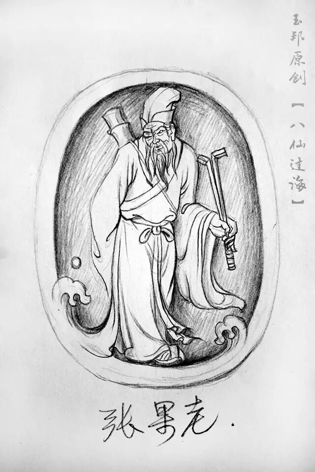 张果老,八仙之三。是年龄最大的神仙。本名张果因他年纪很大(自称活了几百岁,甚至3000年),故名字加"老"字。据传他是史实人物。倒骑宝贝白毛驴(纸驴能折叠),可存放行李中。又因其常携带竹子做的说唱用具(宝贝渔鼓),后人把他看作是"道情"的祖师。