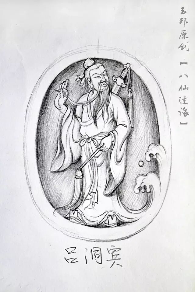 吕洞宾,八仙之五。天下道教主流全真道祖师。虽自幼好学,但三举进士不第。去长安应考,在酒肆里遇见钟离权,让他做了一个建功树名、出将入相、封妻荫子的黄粱美梦,醒后得知功名利禄为梦幻泡影,遂大彻大悟,拜师赴终南山修道成仙。劝说人们弃恶行善。身佩宝物青龙剑,且剑术精通,誉为托梦之神、杂技之祖等。民间有歇后语:“狗咬吕洞宾——不识好人心。”