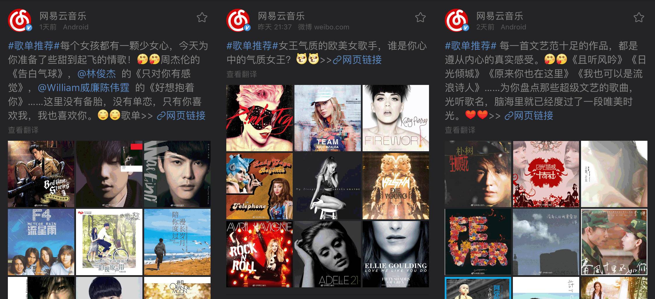 网易云音乐的动态以图文+歌曲的形式进行推送,文风和排版类似微博。