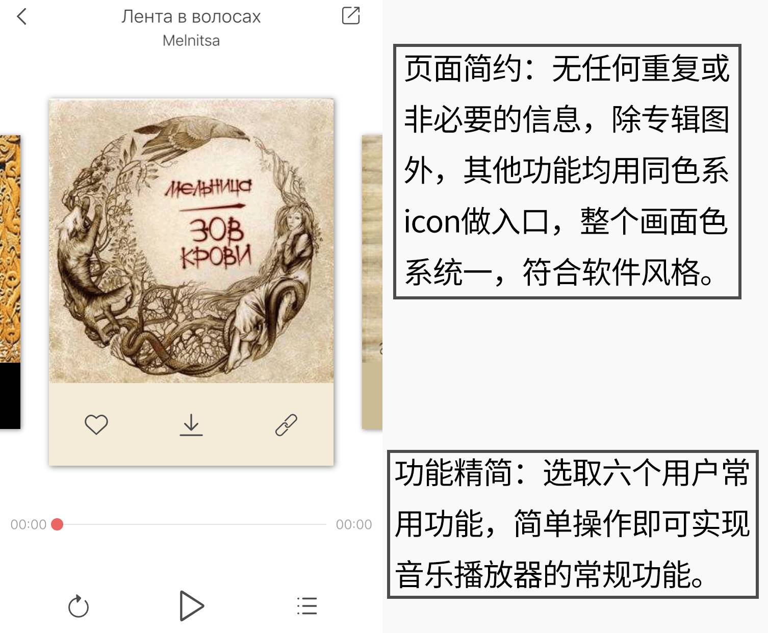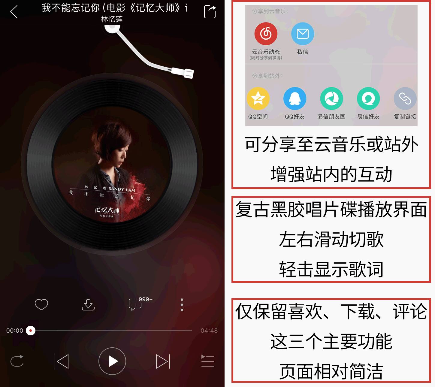 网易云音乐播放界面的功能较为简洁,仅放置喜欢、下载、评论这三个核心功能来满足用户的主要需求,并以特色的老式黑胶碟唱机作为播放界面。更多功能板块收录了”查看歌手“、“专辑详情”等播放器的常用功能,具有普适性。