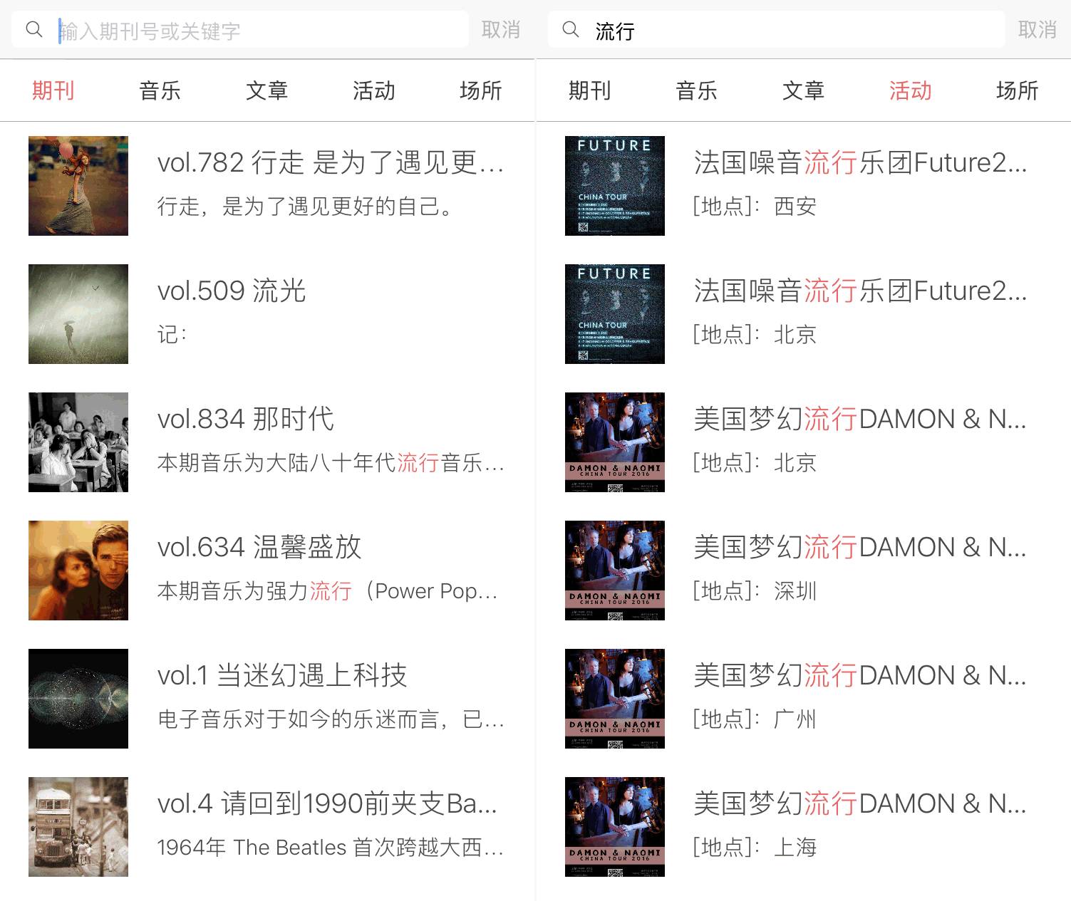 落网由于内容以期刊形式发布,在搜索功能上支持搜索期刊号或关键字,不支持搜索歌手或歌曲名(除非歌曲以单曲形式发布)。关键词搜索结果展示有5个分类:(以搜索“流行”为例)