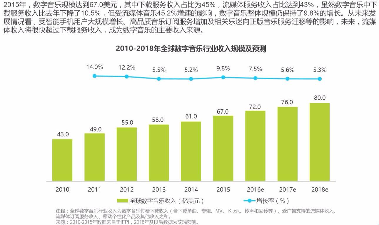 产业环境:自2015年以来,据艾瑞咨询数据显示,数字音乐的规模首次超过实体唱片,达到67.0亿美元,并且在未来流媒体收入会超过下载服务收入,成为数字音乐的主要收入来源。