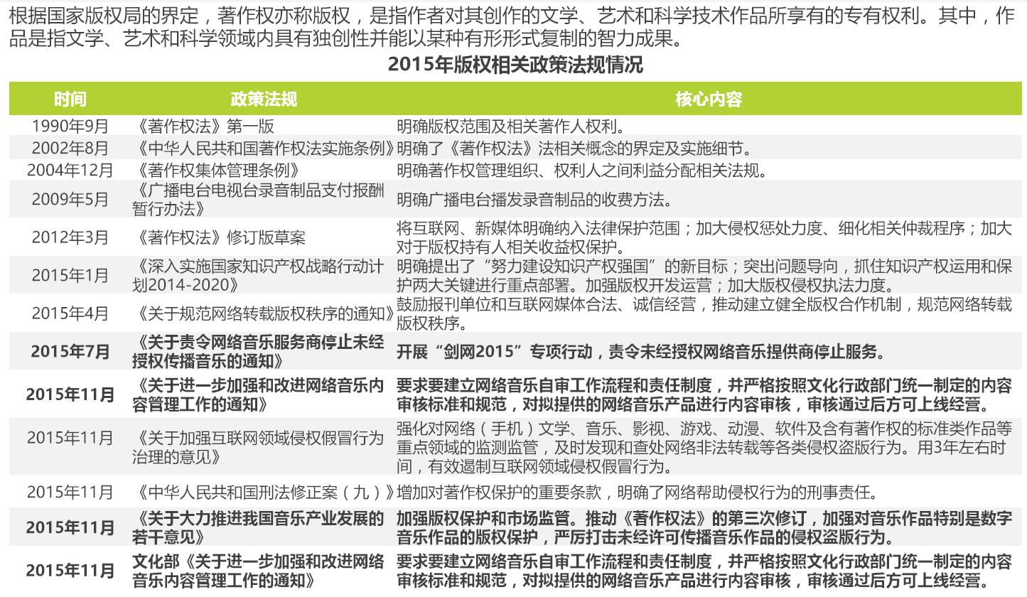 政策环境:国家对版权力度的不断加强,也使得这个市场越来越规范,同时加强了在线音乐竞争的壁垒。