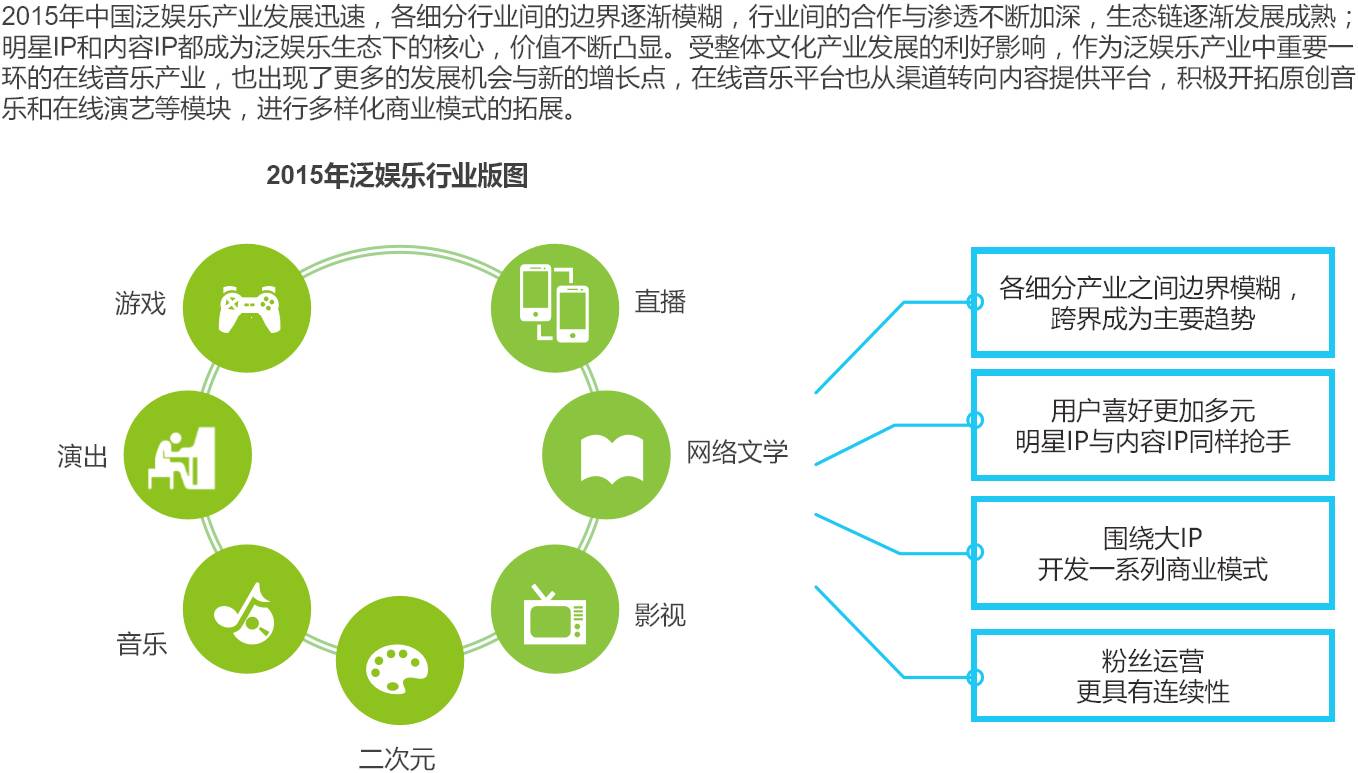 商业环境:泛娱乐打破以往独立发展的态势,各细分行业之间的合作与渗透不断加深, 跨界成为了主要趋势,出现更多的发展机会与增长点。