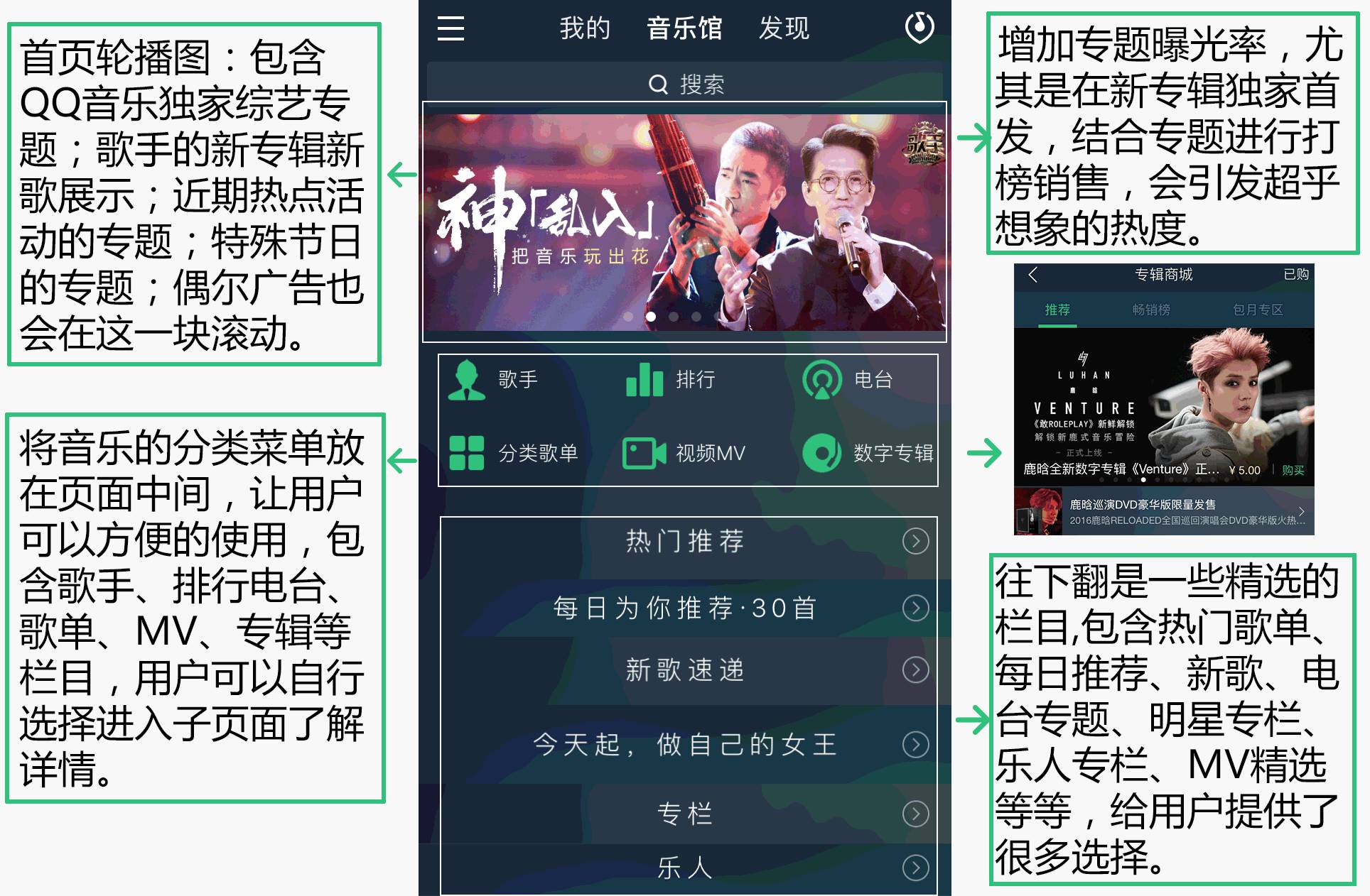 QQ音乐的音乐关界面,主要进行信息展示,包括歌手、排行、电台、分类歌单、视频MV、数字专辑等6个子目录的分类菜单,页面往下翻是一些精选的栏目,包括歌曲推荐、新歌推荐等6-8栏目的内容可供浏览,而且会根据特定的节日、季节等对栏目的内容进行调整,在收听上的选择集中在一个页面。