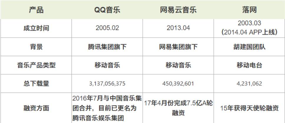 因此,本文选择“网易云音乐”和”落网“作为“QQ音乐”的竞品对象,以下是这个产品多维度对比: