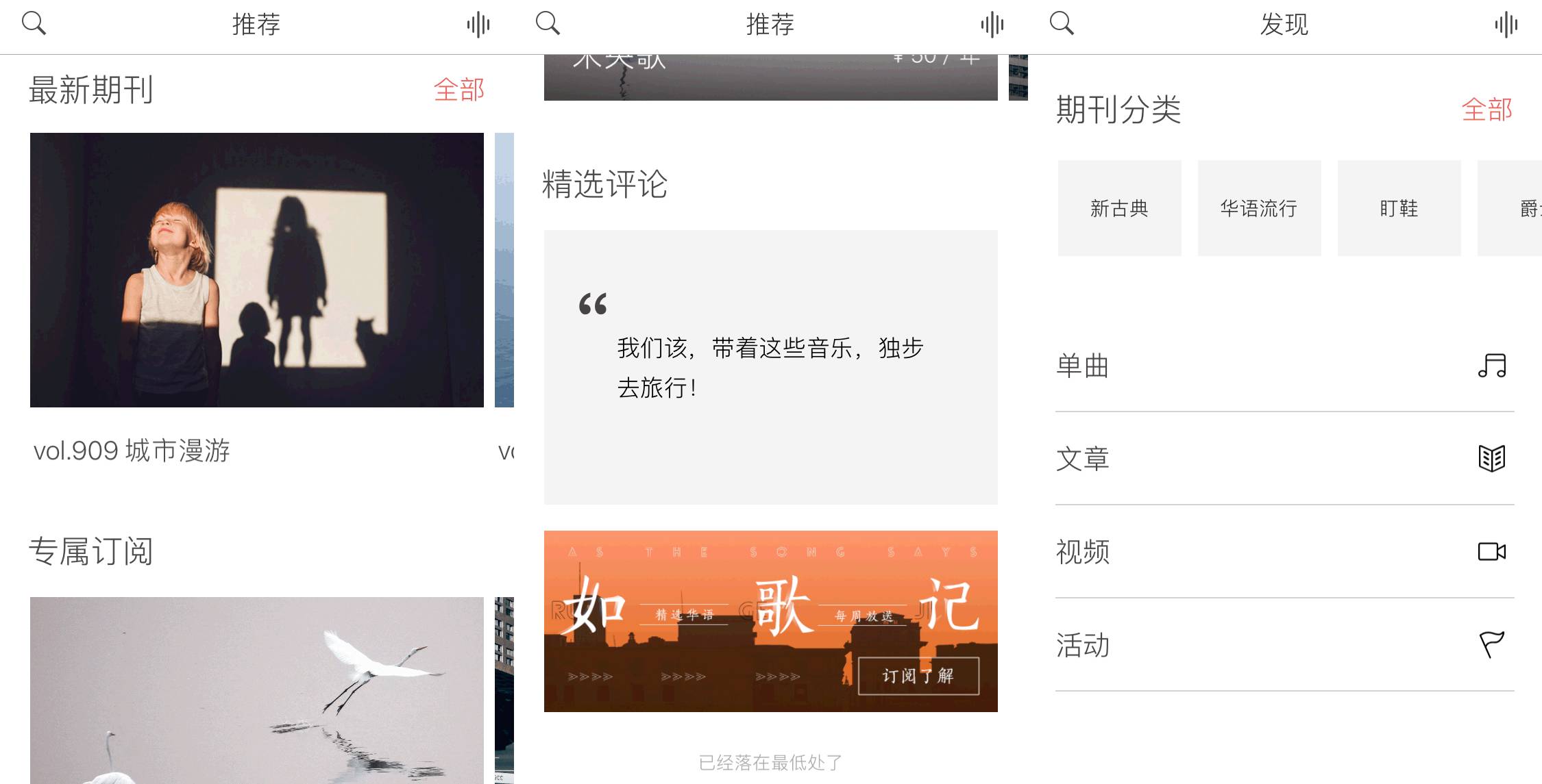 落网的内容以官方团队制作的期刊为主,除了首页的banner之外,推荐的常规内容只有三个:最新期刊(官方团队制作)、专属订阅(付费期刊)、精彩评论。