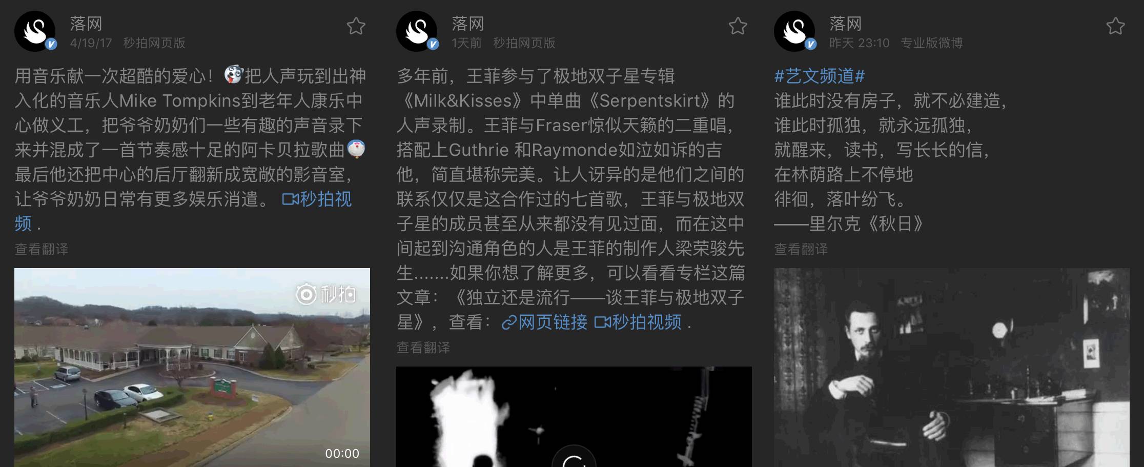 落网在新媒体运营上,除了推广音乐期刊的内容,还会根据自己的品牌定位去推送一些相关内容,来丰富内容的多样性,如诗歌作品,独立音乐相关的视频等。