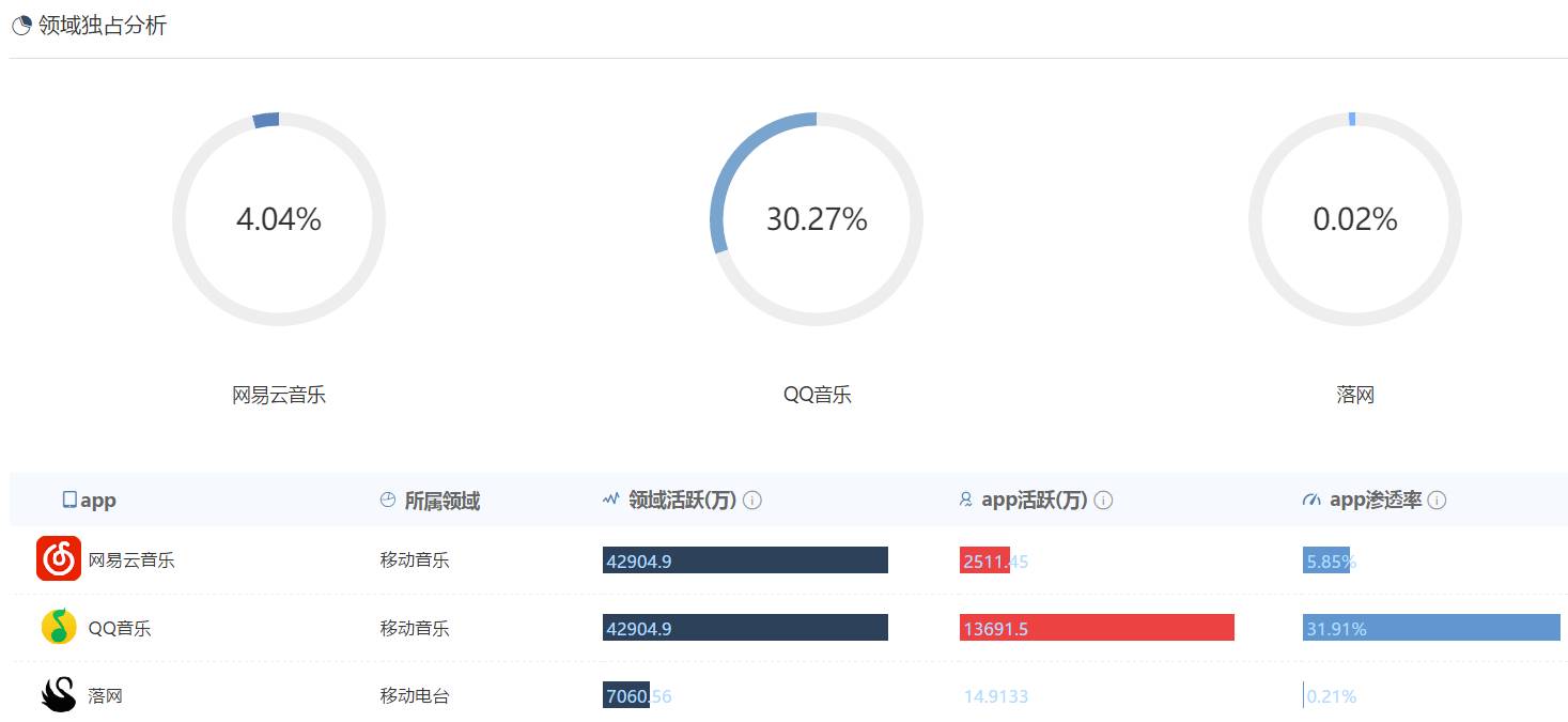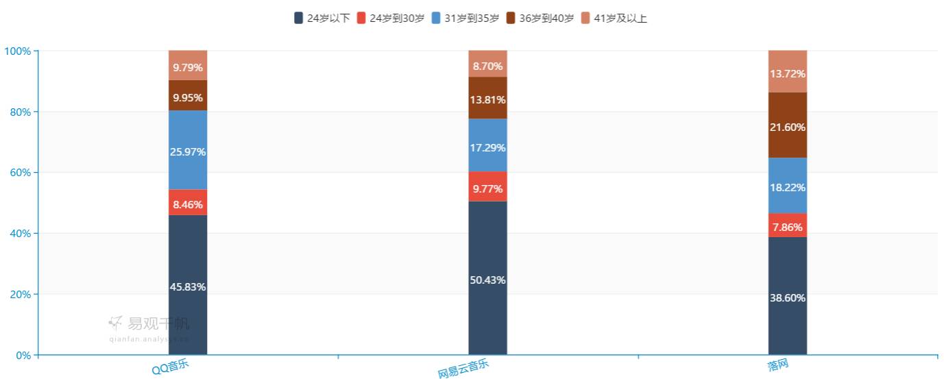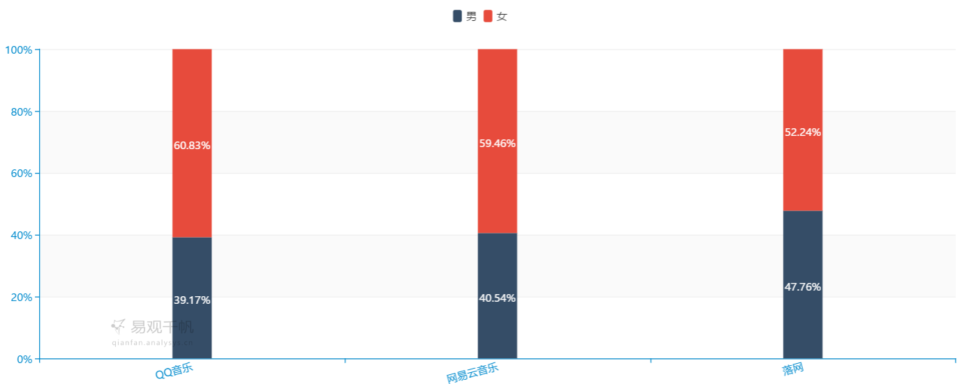 通过易观千帆的数据显示,QQ音乐与网易云的男女比例为4:6,落网用户男女比例大致为1:1,女性用户偏多一些。