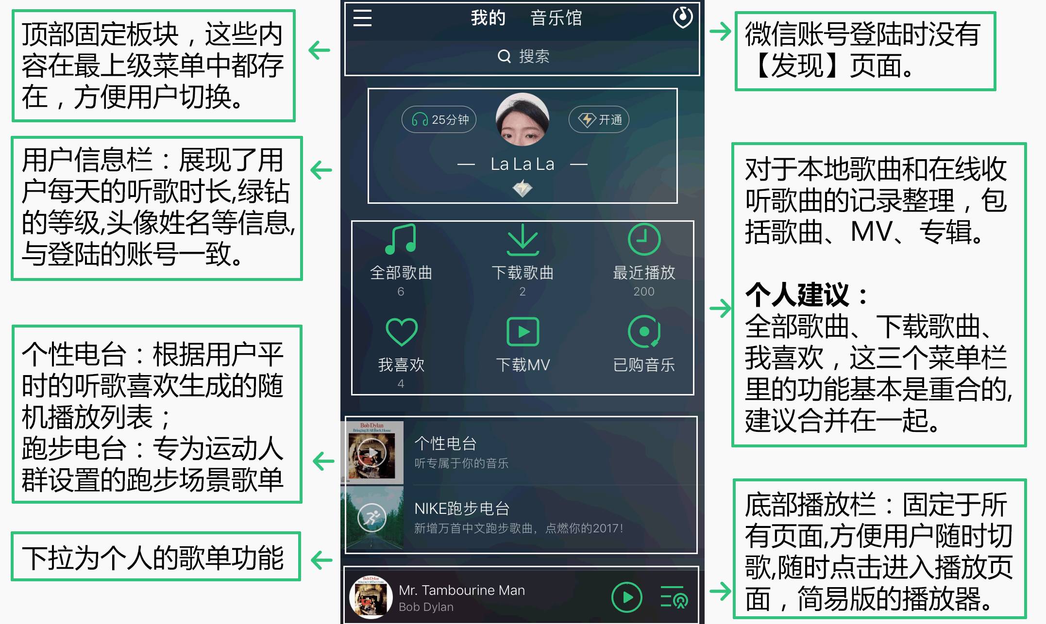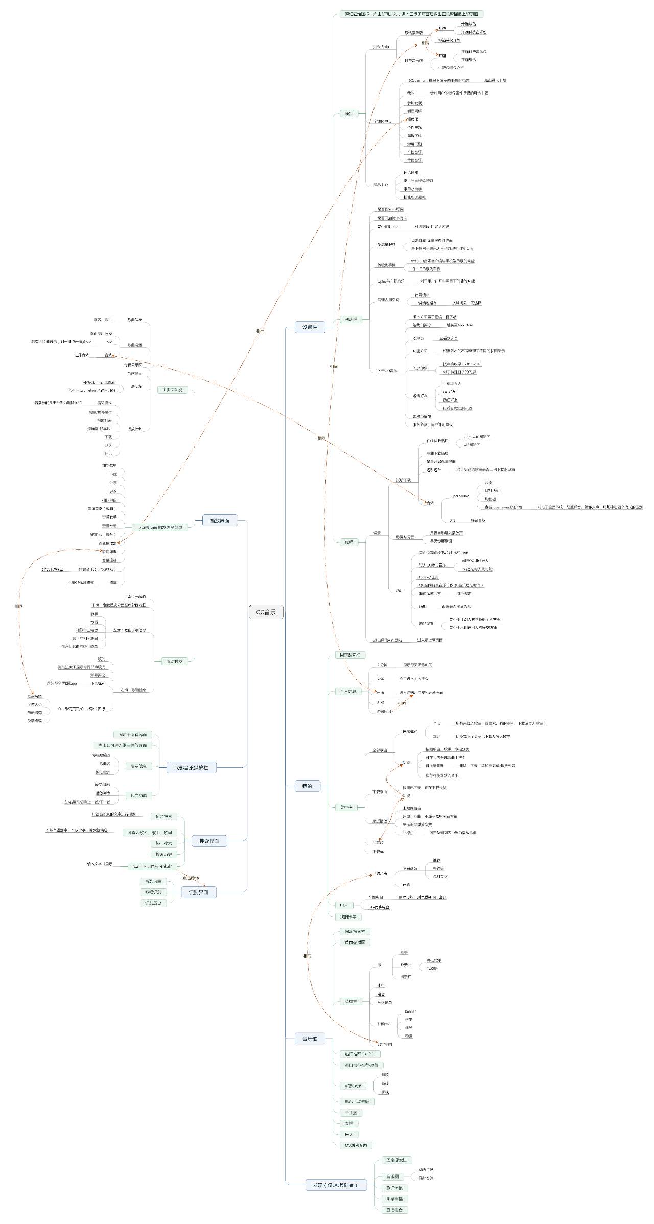 整个框架的结构布置合理,且不管用户在哪个页面,下方始终悬停着“正在播放”的小播放器,左右滑动即可切歌,降低了用户的切换成本。歌曲播放界面设置了常用功能的入口,充分考虑了深度用户的需求。