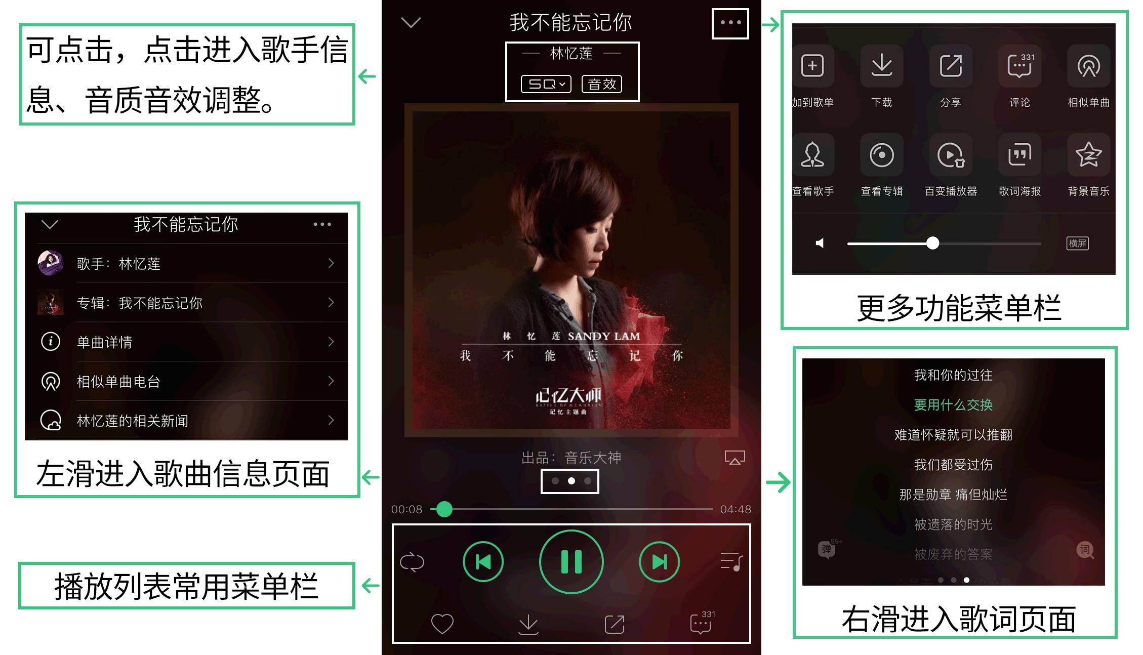选择一首歌曲收听,以林忆莲的新歌《我不能忘记你》为例,进入播放页面: