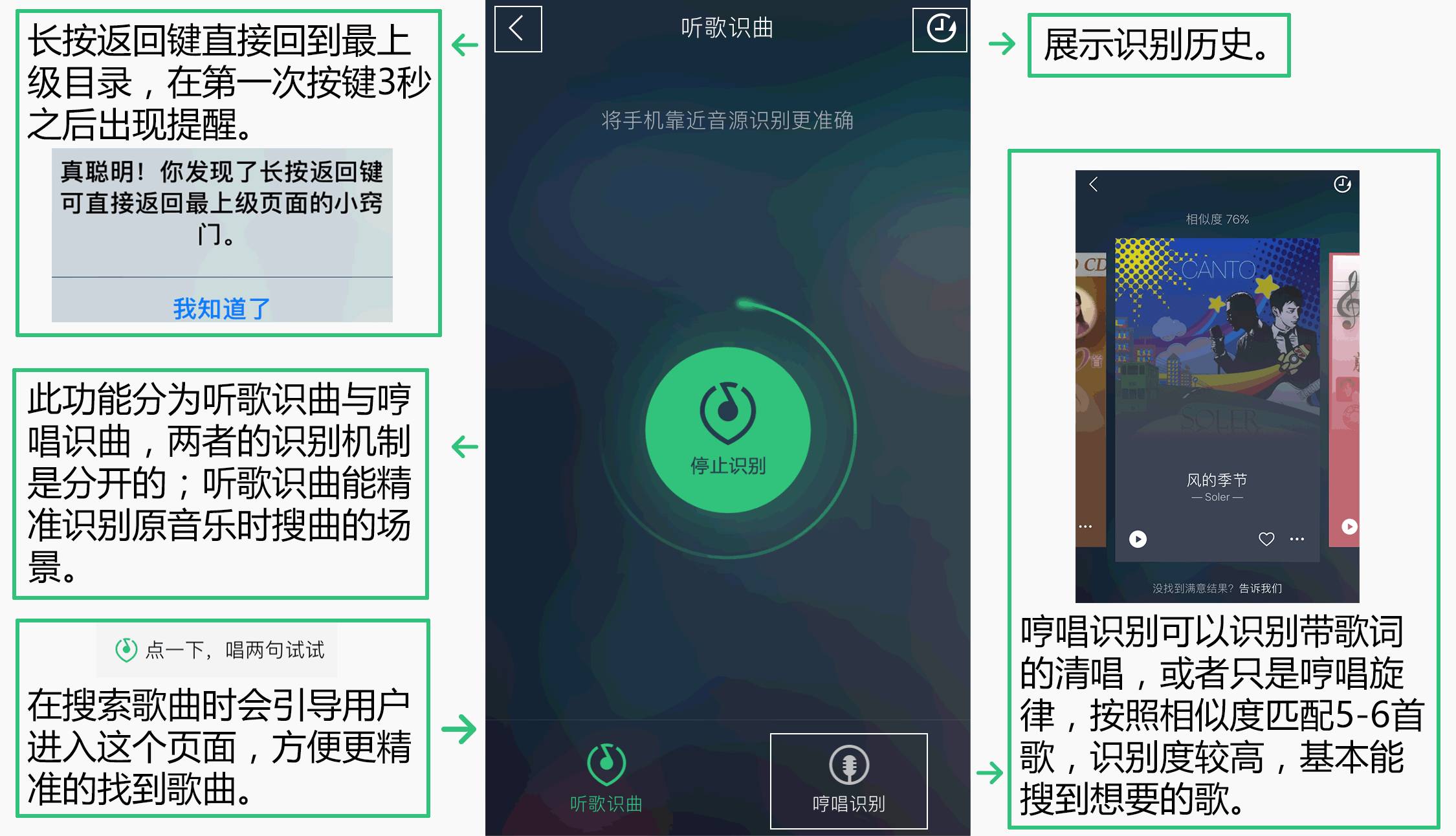 此音乐识别系统适用于用户记得零碎的旋律或歌词的情况,并且在搜索页面输入内容时会引导用户进入哼歌识曲页面。
